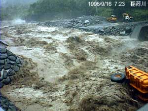 工事用車両が横転したり水没した。