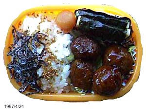 ミートボール、チーズ海苔巻き、塩昆布、たまり漬けらっきょう、ごはん。