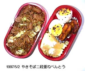 ウィンナー入り焼きそば、ゆで卵、チキンナゲット、スウィティー。
