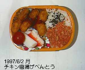チキンナゲット、かに風蒲鉾、ミニトマト、ごはん、鮭フレーク、ごま塩。