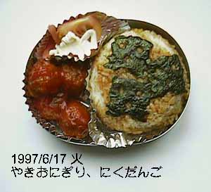ミートソース肉団子、トマト、焼きおにぎり、のり。