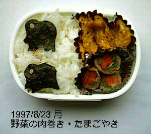 野菜の肉巻き、チーズ卵焼き、ごはん、のり。