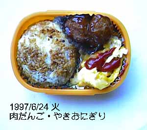 焼きおにぎり、甘酢あん肉団子、チーズ卵焼き。