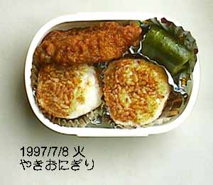 焼きおにぎり、チキンバー、キュウリの塩もみ。