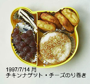 チキンナゲット、チーズ海苔巻き、チキンナゲット、焼きおにぎり、ぶどう。