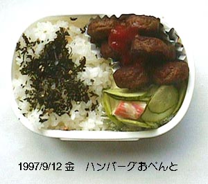 ハンバーグ、キュウリ、カニ蒲鉾、ごはん、ワカメふりかけ。