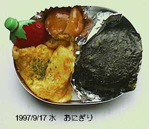 チーズ卵焼き、おにぎり、カリカリ梅。