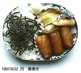 春巻き、お魚ソーゼージ、ごはん、たくあん、チーズ。