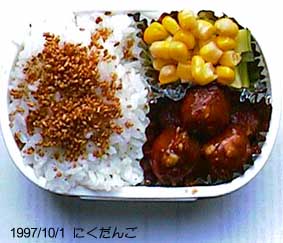 肉団子、コーン、きゅうり、ごはん、ごまふりかけ。