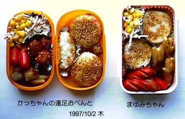焼きおにぎり、赤いウィンナー、ベーコンポテト、ゴボウサラダコーン入り。