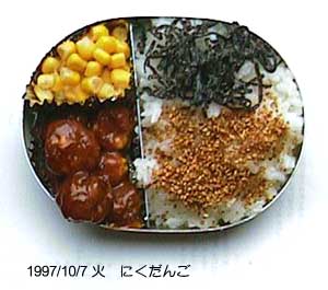 甘酢肉団子、コーン、ごはん、ゴマふりかけ、しおこんぶ