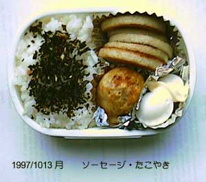 ボローニャソーセージ、たこやき、ウズラの卵、ごはん、わかめふりかけ。