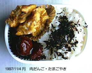 肉団子、卵焼き、ごはん、わかめふりかけ。