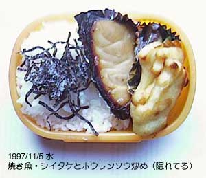 焼き魚、椎茸とほうれん草炒め、ごはん、しおこんぶ。