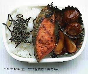 鮭の塩焼き、ミートボール、ウィンナー、ごはん、塩昆布