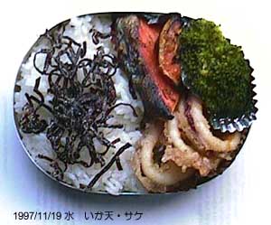 紅鮭焼き、ブロッコリー、イカのフライ、ごはん、塩昆布。