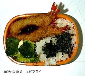 エビフライ、ブロッコリー、ごはん、しおこんぶ、葉唐辛子。