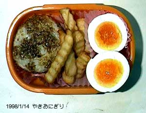 焼きおにぎり、半熟卵、ポテトフライ。
