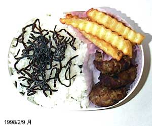 ポテトフライ、ハンバーグ、ごはん、塩昆布。