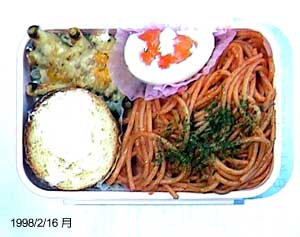 ケチャップ味スパゲッティ、焼きおにぎり、半熟卵、グラタン。