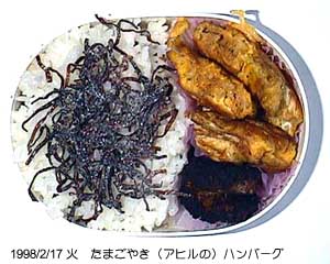 アヒルのたまごの卵焼き、黒こげハンバーグ、ごはん、塩昆布。