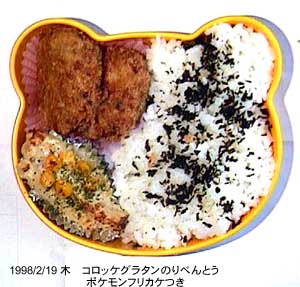 コロッケ、グラタン、ごはん、鮭ワカメふりかけ。