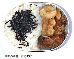 鳥の唐揚げ、ポテトフライ、ごはん、しおこんぶ。