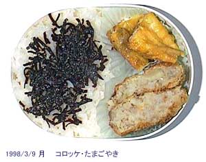 コロッケ、卵焼き、ごはん、しおこんぶ。