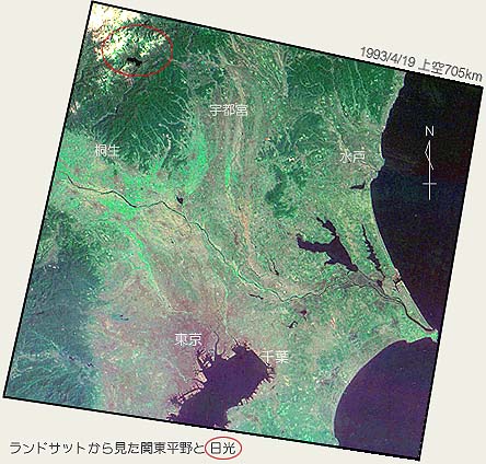 右の写真は約700q上空のランドサットからの関東平野です。都市化が進んでいるところは赤褐色に、海や川は黒色、森林や農地は緑色、積雪地は白色にデジタル処理されています。