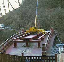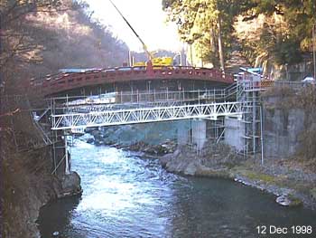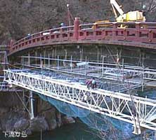 それと、神橋の上の赤い鉄骨は、今日その上に小さなクレーンが乗っているのをみて、本当の使い方がわかりました。(写真下左)