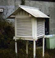 観測機器の入っている百葉箱。屋根が腐っていて廃棄処分するものをもらって修理して使っている。