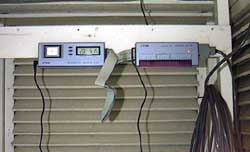 百葉箱の中の観測機器。左の機械の白く四角いセンサーで気温と湿度を測定し、右の機械がAD変換をしている。 そして家の中にあるPC(98note)のシリアルポートにつながっている。