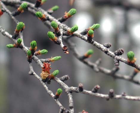 カラマツは新芽を包んでいた茶色の鱗片と新芽そのものの緑色で、遠くから見ると、とても渋いダークグリーンの海のように見えます。写真左が三本松のカラマツの林の色、写真右がその拡大。