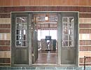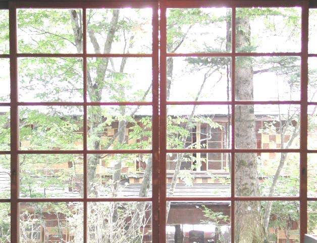 木製の窓枠のゆがみのあるガラスを通して大使館別荘が正面に見えます。