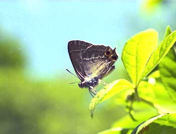 アイノミドリシジミと同じく「ゼフィルス」と呼ばれるシジミチョウの一群。♂は森の開けた場所で、写真のように占有行動をとる。奥日光では落葉広葉樹林帯全域で見られる。